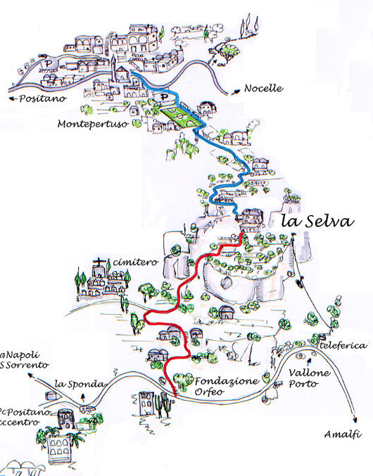 La Selva can be reached only and exclusively on foot in 15 minutes of downhill path from Montepertuso (the hamlet above Positano) starting from the sports field and in 25 minutes from the s.s. 163 in Positano towards Amalfi, 50 meters after the junction “la sponda” on the left you will find a staircase marked Orpheus Foundation, follow the tiles with the green sapling symbol of La Selva.